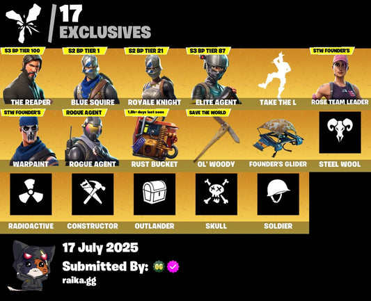 ⭐[PC/PSN/XBOX]⭐30 skins 🎉 OG STW 🎉 The Reaper ⚡ Blue Squire ⚡ Royale Knight ⚡ Elite Agent ✨ Take The L ✨ Rogue Agent | Dark Voyager | Battle Hound | Power Chord | 1650 VB