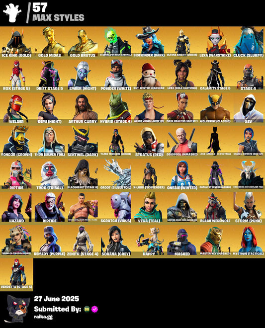 59 skins | OG STW | Gold Brutus | Fishstick (World Cup) | Gold Midas | Trilogy | Carbon Commando | Prodigy | John Wick | Rox | The Ice King