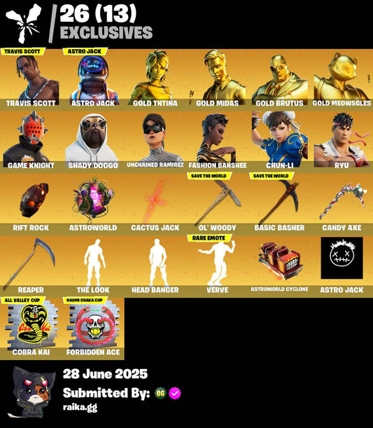 ⭐🎉𝙎𝙏𝘼𝘾𝙆𝙀𝘿 🎉⭐ 243 SKINS 🔥 Travis Scott 🔥 Astro Jack 🔥 Gold TNTina 🔥 Gold Midas 🔥 Gold Brutus 🔥 Gold Meowscles 🔥Game Knight | Shady Doggo 🔥 Unchained Ramirez 🔥 130 VB